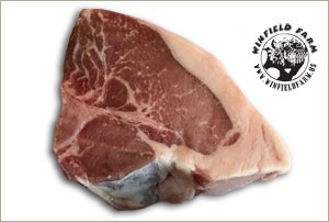 Winfield Farm Mangalitsa loin chops are butchered bone-in, tenderloin in, similar to a T-bone steak.